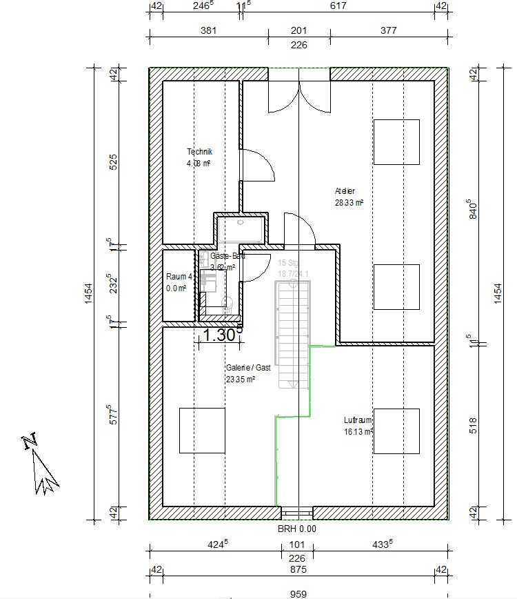 - OG ... Zum problemlosen Anliefern der Haustechnik eine Doppelfenstertür im Atelier. Zugang Technik auch vom Atelier