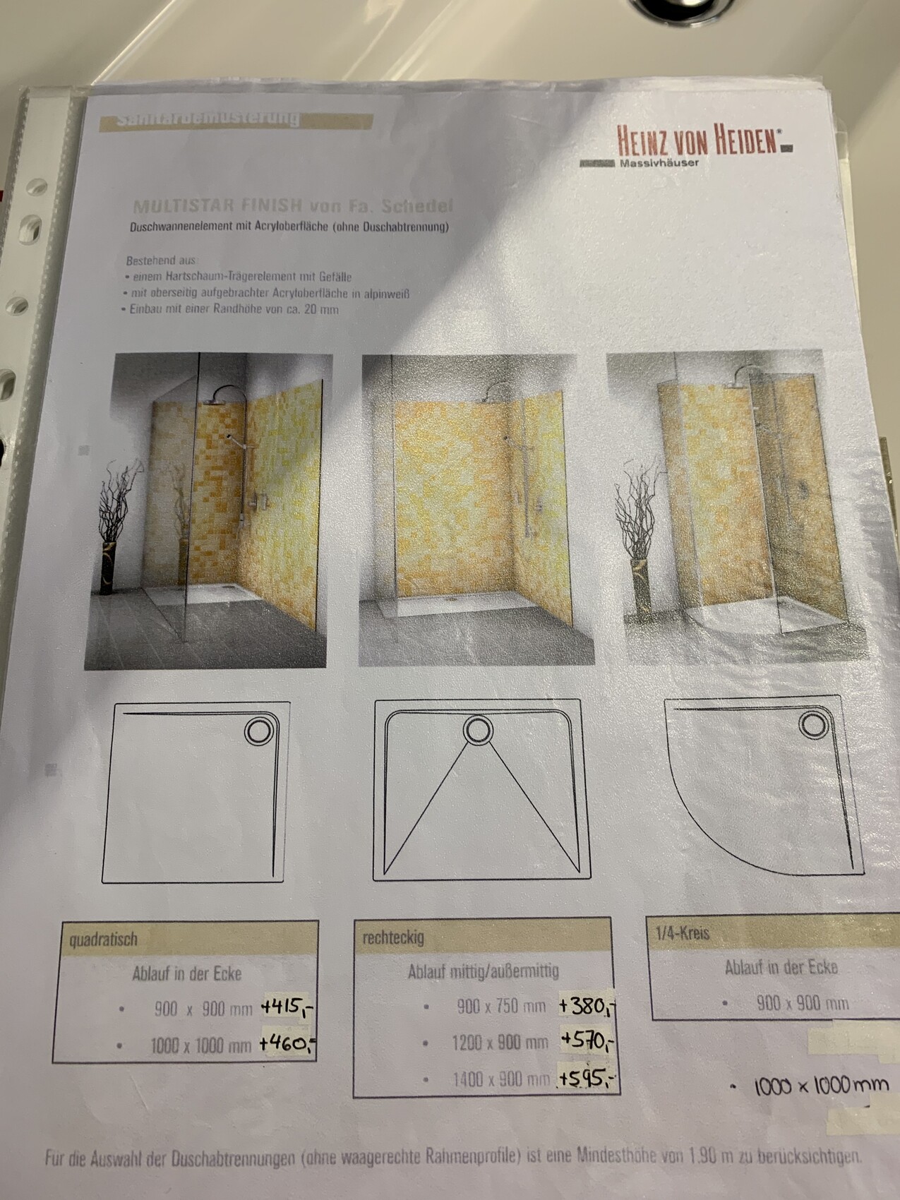 Hier mal aus dem Ordner meine 20mm Duschtasse (das mittlere Modell in der mittleren Größe). Im Hausvertrag ein abweichender Preis (höher) als hier in der Preisliste. Muss ich noch mal klären.