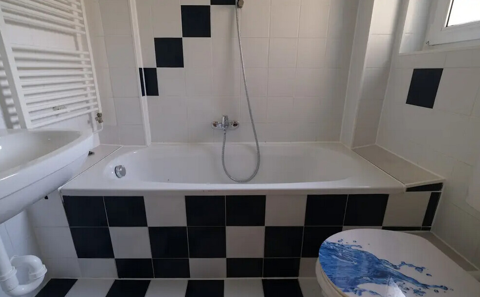 Treffender wäre aber ein Bad in schwarz-brauner Fliese von 1965 & schlechtem Zustand - vom Vorbesitzer schon günstigst verschlimmbessert. Das eben eigentlich fällig wäre. Wo aber nach Erwerb auf lange Zeit dafür kaum Geld sein wird, denn bei der Ölheizung, der Elektrik und dem Dach steht auch was an.