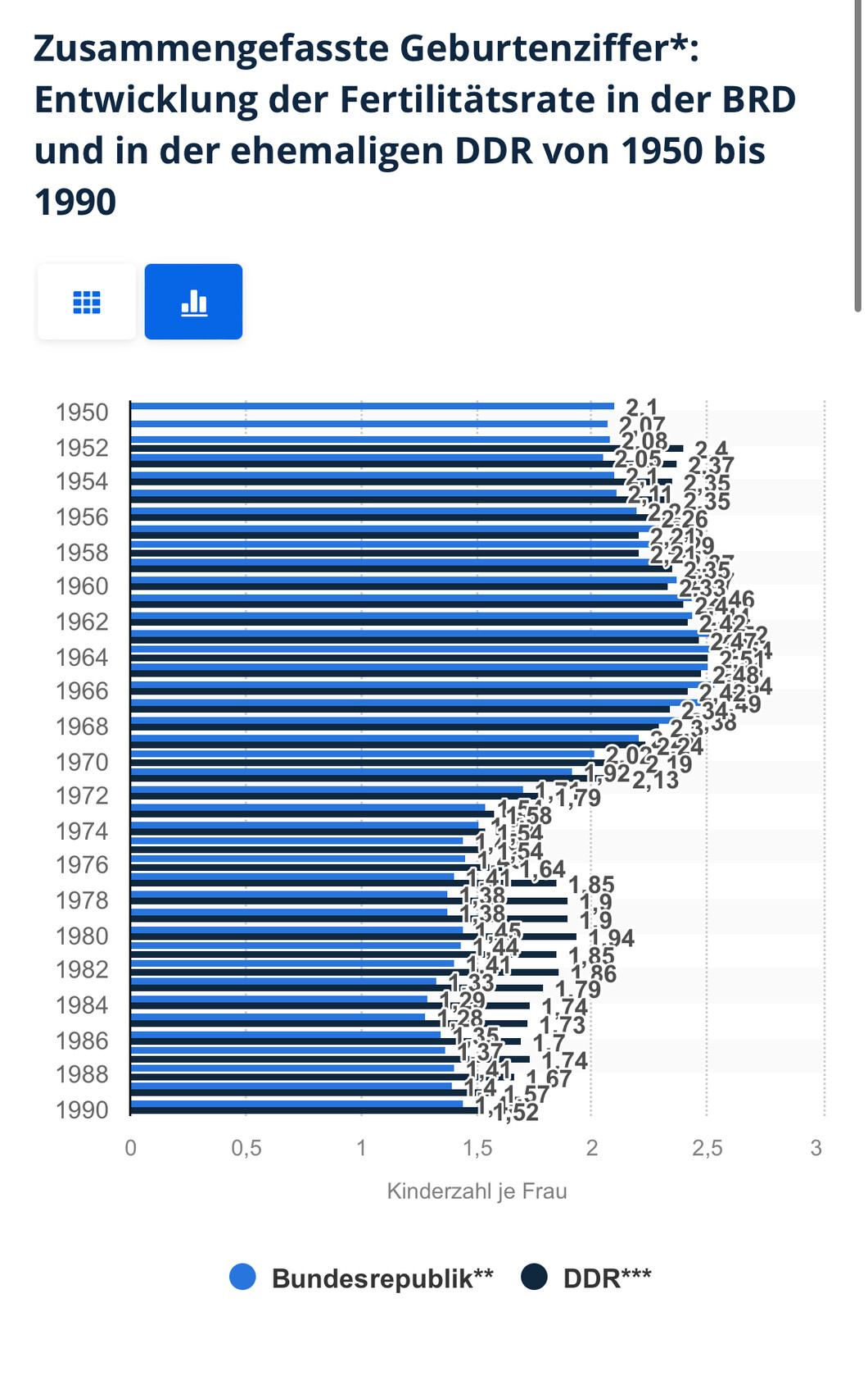 Die Geburtenrate in der DDR war 4 x so hoch wie in der Bundesrepublik.Steile These. Gibt's dazu nen Beleg oder ist das wieder ein alternativer Fakt?K