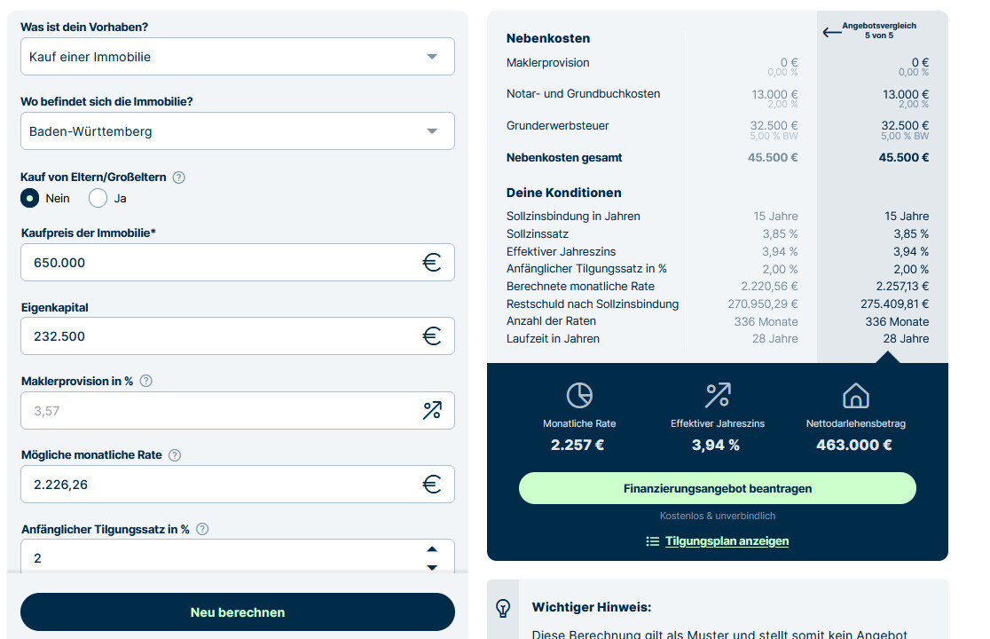 Im Baufinanzierungsrechner habe ich am Eigenkapital mal etwas gespielt, weil der automatisch auch die Grunderwerbsteuer noch berechnet.