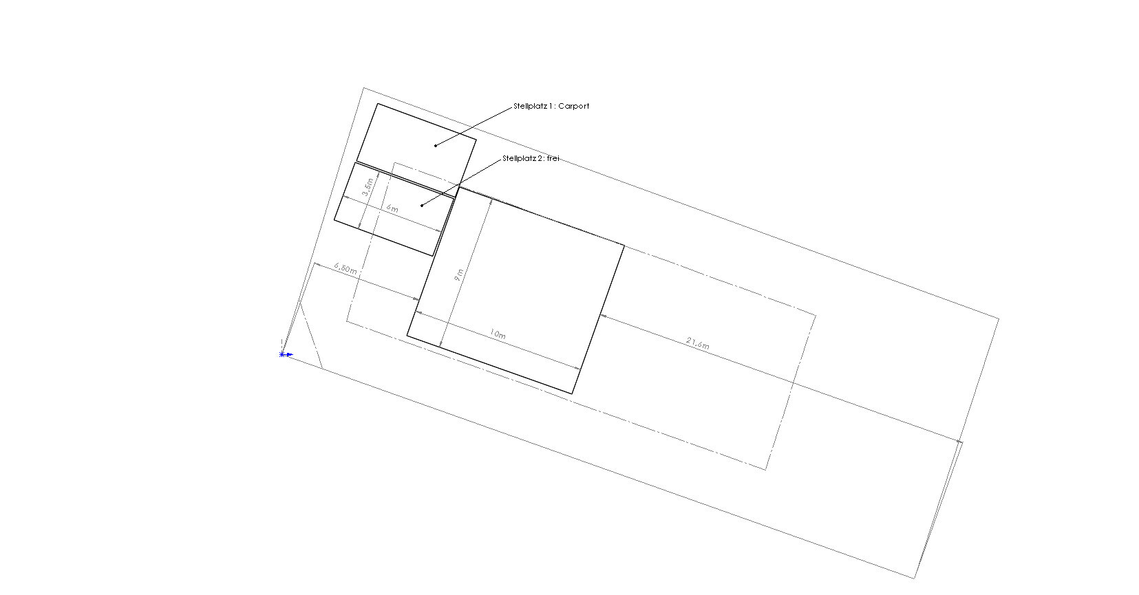 Schräger Grundrissplan: Haus mit Carport und zwei Stellplätzen, Maßlinien sichtbar.