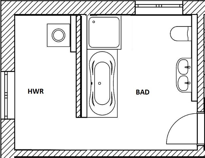 Grundriss eines Badezimmers mit Badewanne, Doppelwaschbecken und Tür; daneben HWR mit Waschmaschine.