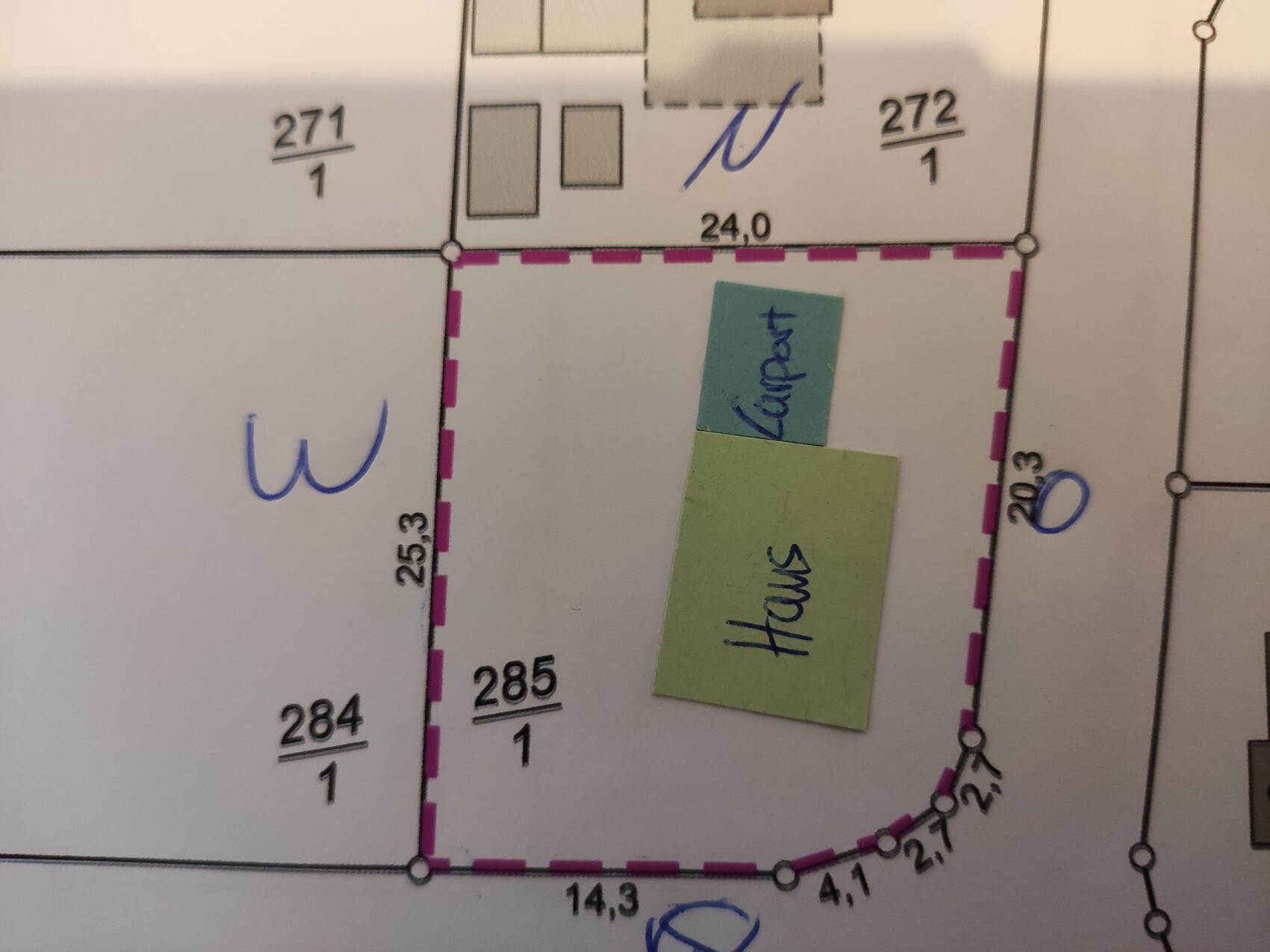 Lageplan eines Grundstücks mit pinkfarbener Umrandung; grüner Zettel 'Haus' und blauer Zettel daneben.