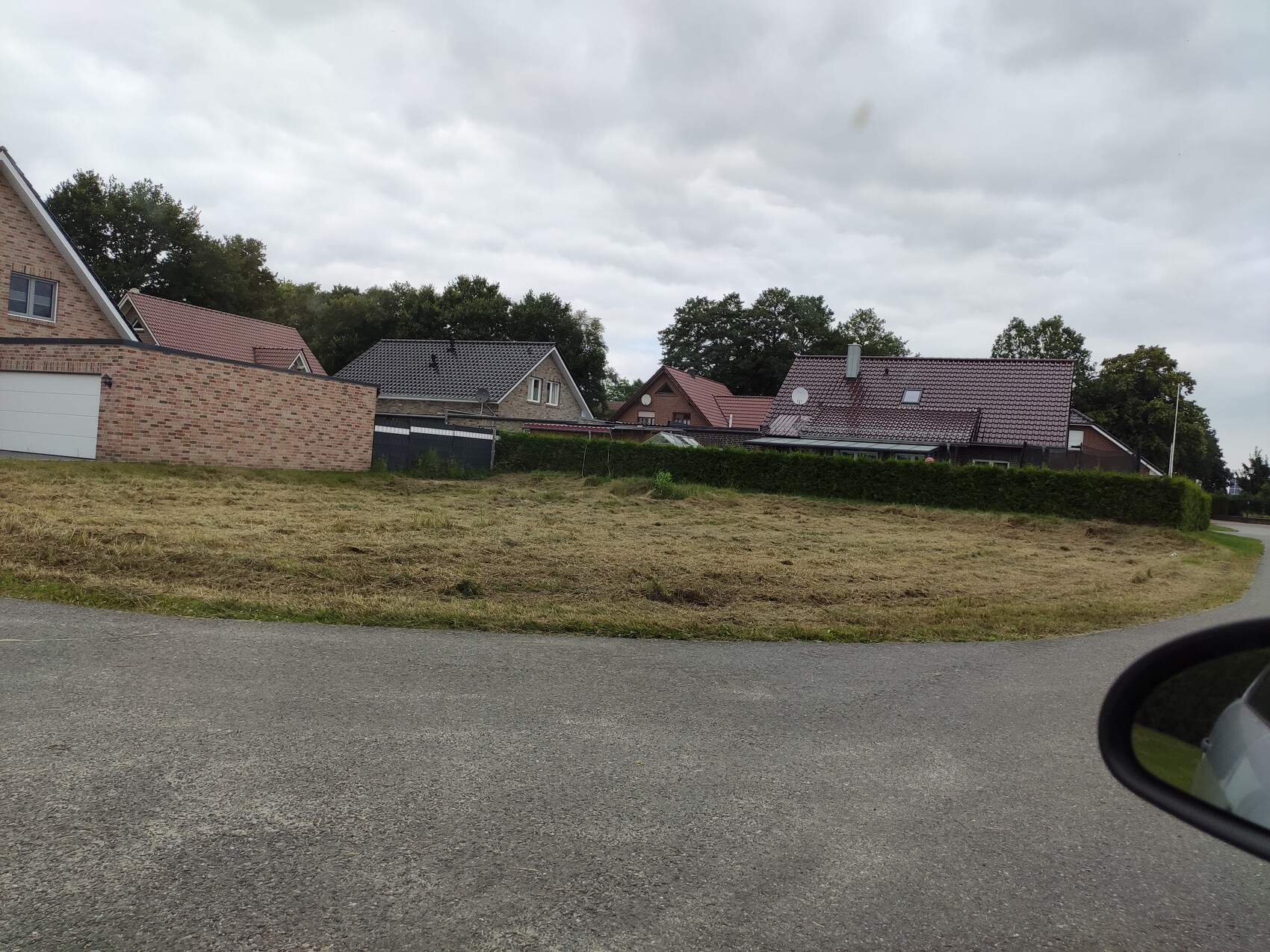 Wohnsiedlung mit Einfamilienhäusern, brachliegendem Grasfeld im Vordergrund, kurvige Straße rechts.