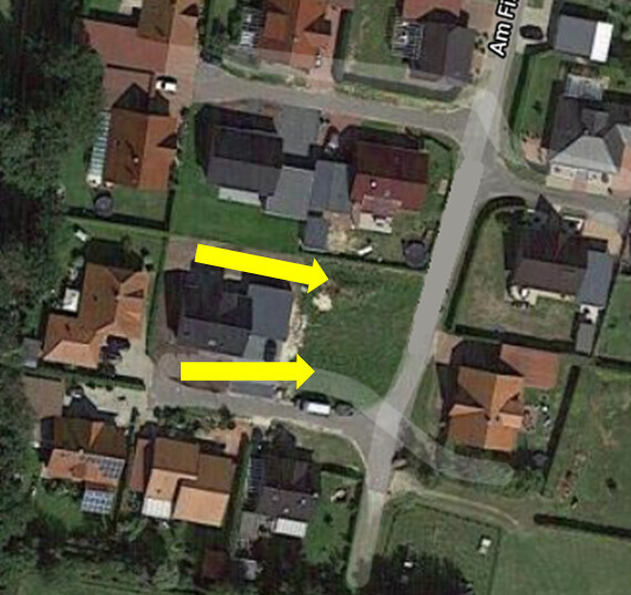 Luftbild einer Wohnsiedlung; zwei gelbe Pfeile zeigen Einfahrten zu Häusern an einer Straße.