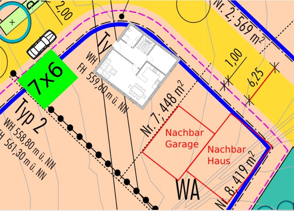 bis zur blauen dickeren Linie darf das Haus gebaut werden. Bis zur gestrichelten violetten Linie darf die Garage gebaut werden.