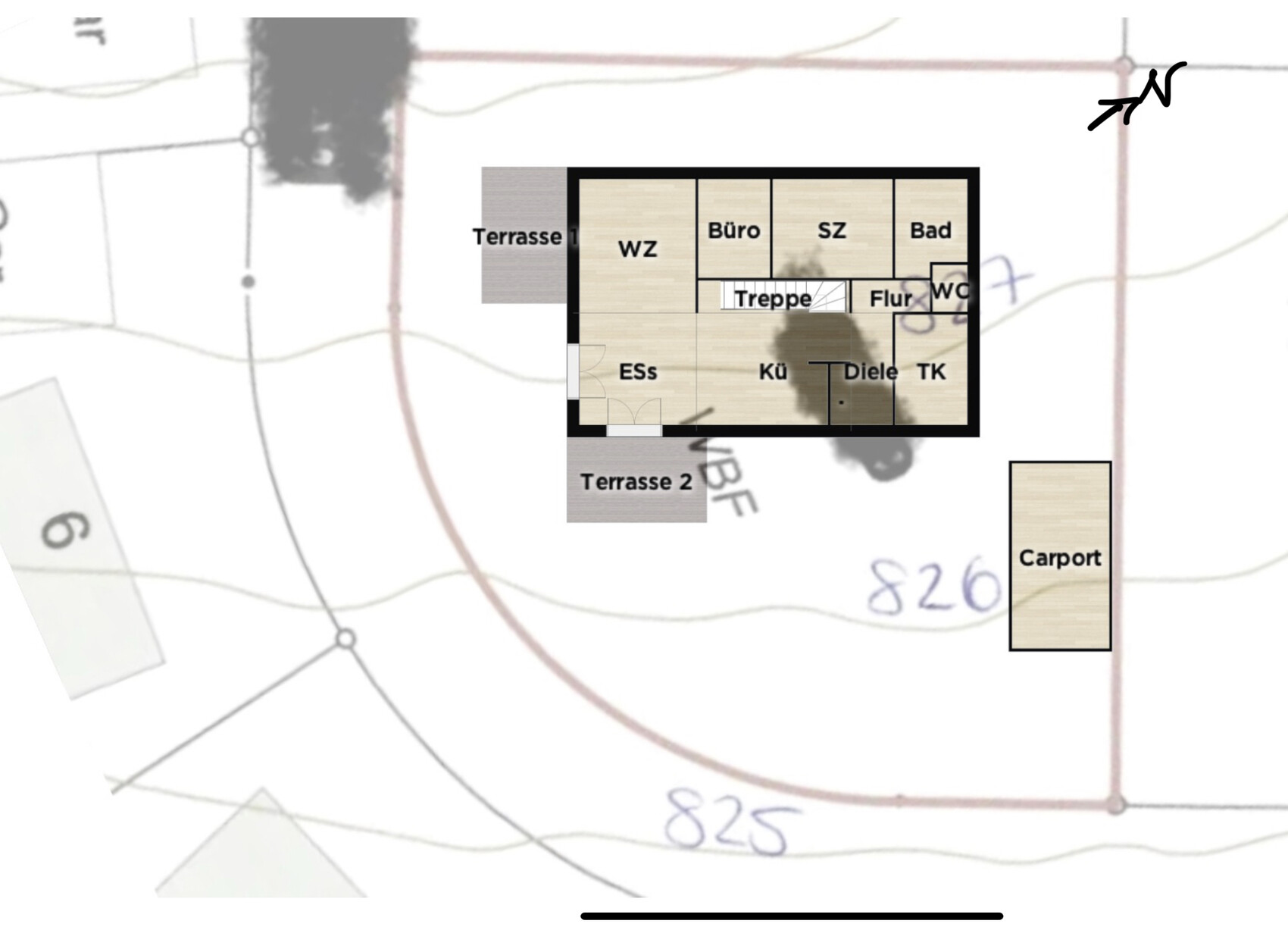 Von welcher Seite aus wäre die Zufahrt zum Carport? Versteh ich das richtig, dass du das EG in den Hang zum Nachbarn Nr. 19 platzierst (Höhe 827), mit der Konsequenz die eine Hauswandseite im Hang ist? Carport und Haus wären dann auf unterschiedlichen Höhen, oder?