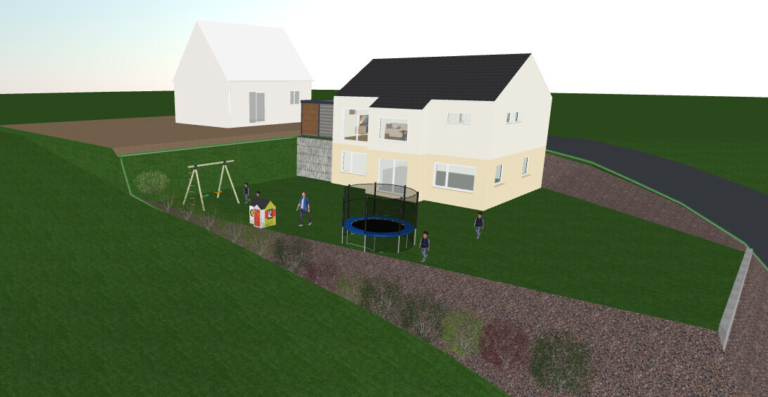 Das geht auch ohne Stützmauern, dann einfach den Aushub im Süden auftragen und zu den Grenzen 1:2 AbböschenHabs mal versucht.