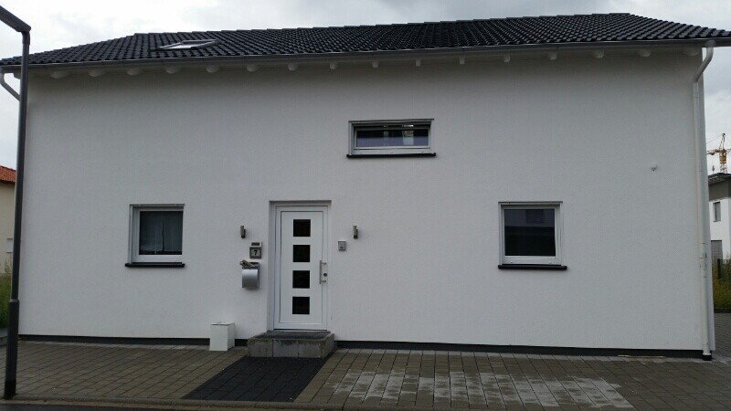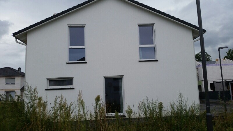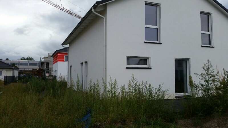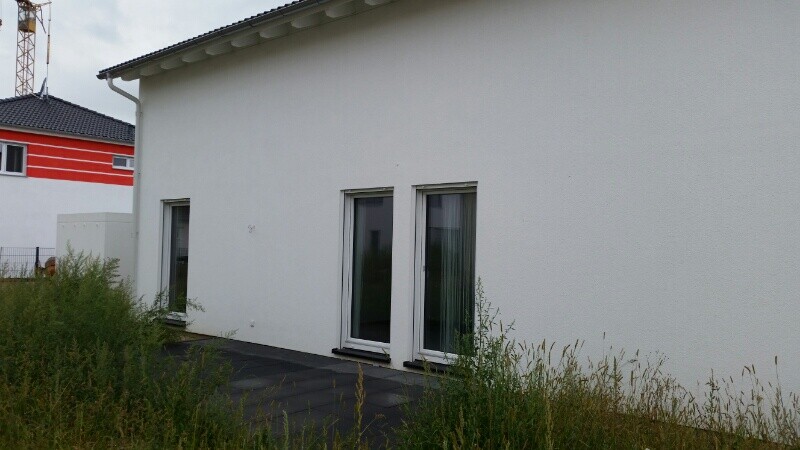 Die bodentiefen Fenster und der hohe Kniestock sind, meiner Meinung nach, klare Pluspunkte. Garage, Hof und Hauszugang sind auch fertig und den Garten könntet Ihr noch gestalten wie Ihr mögt...