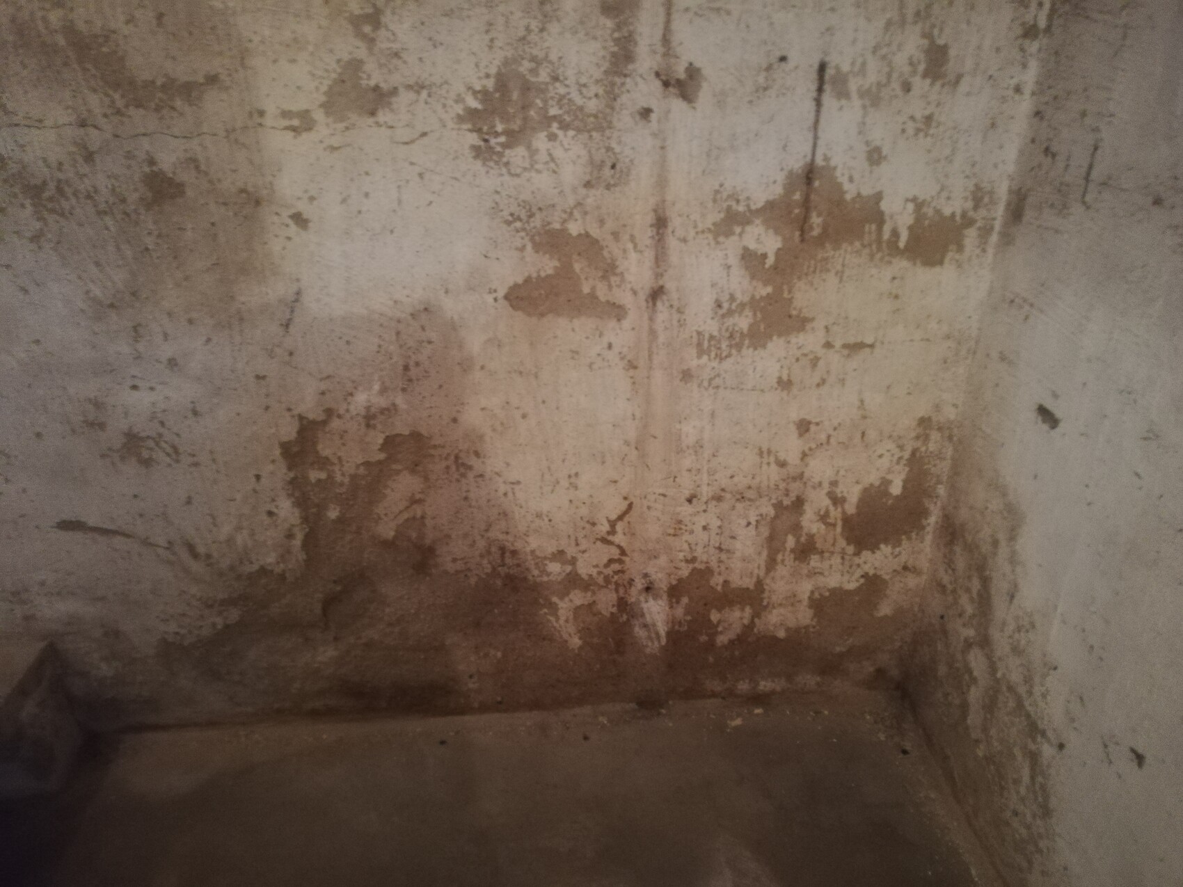 Keller-Ecke mit feuchten, dunklen Betonwänden und staubigem Boden.