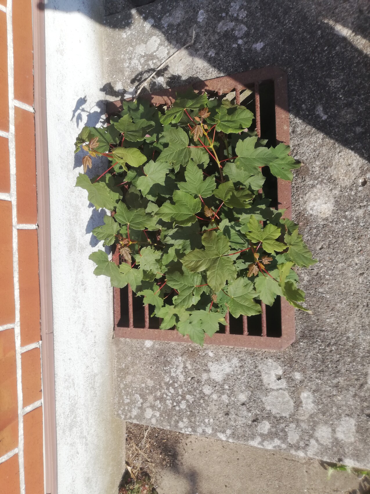 Grüne, lobblättrige Pflanze wächst in quadratischem rostbraunen Gitterrost-Drainagedeckel auf Beton.