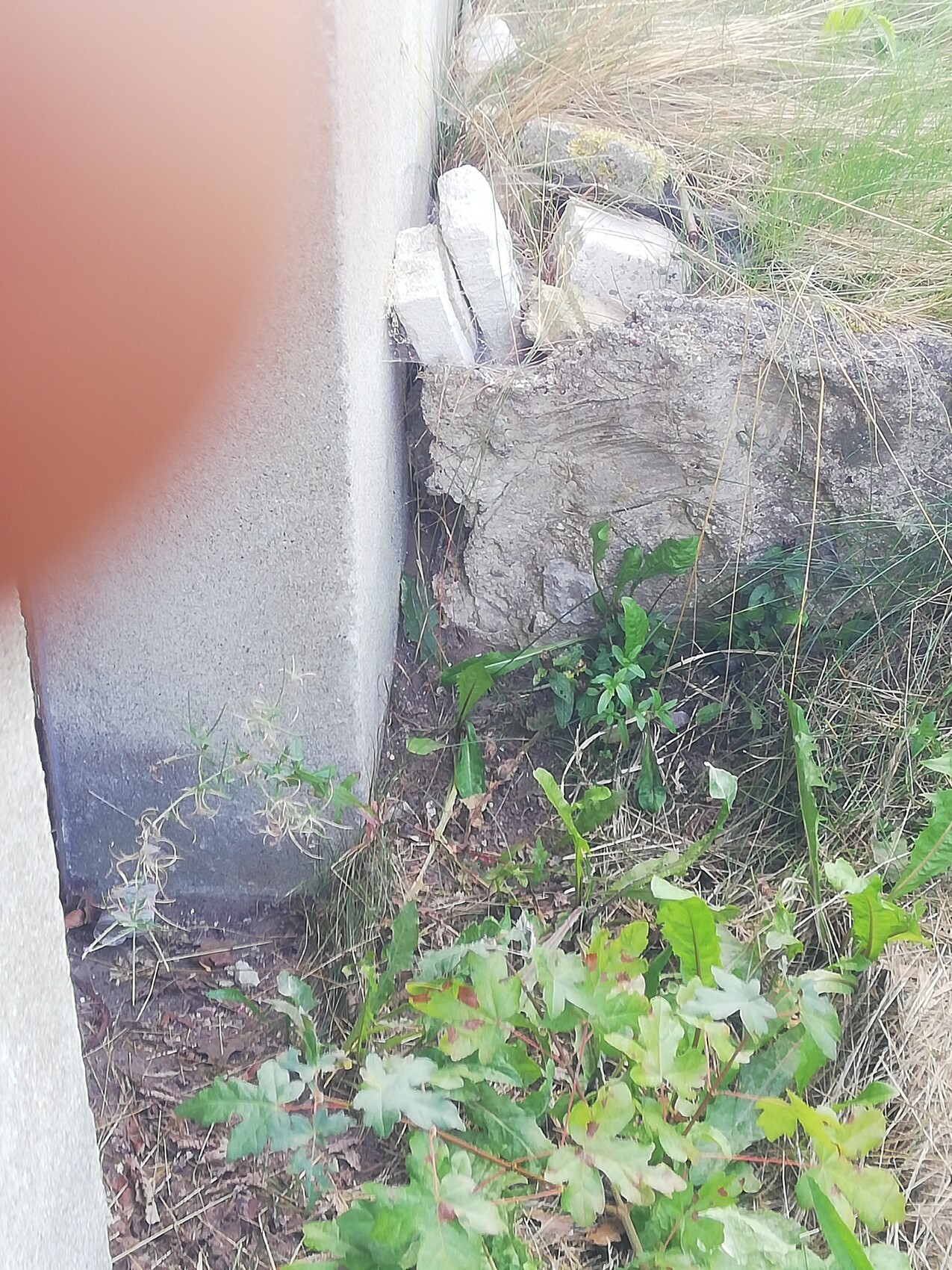 Außenbereich: bröckelige Betonmauer, Steinreste, Gras und Unkraut am Boden.