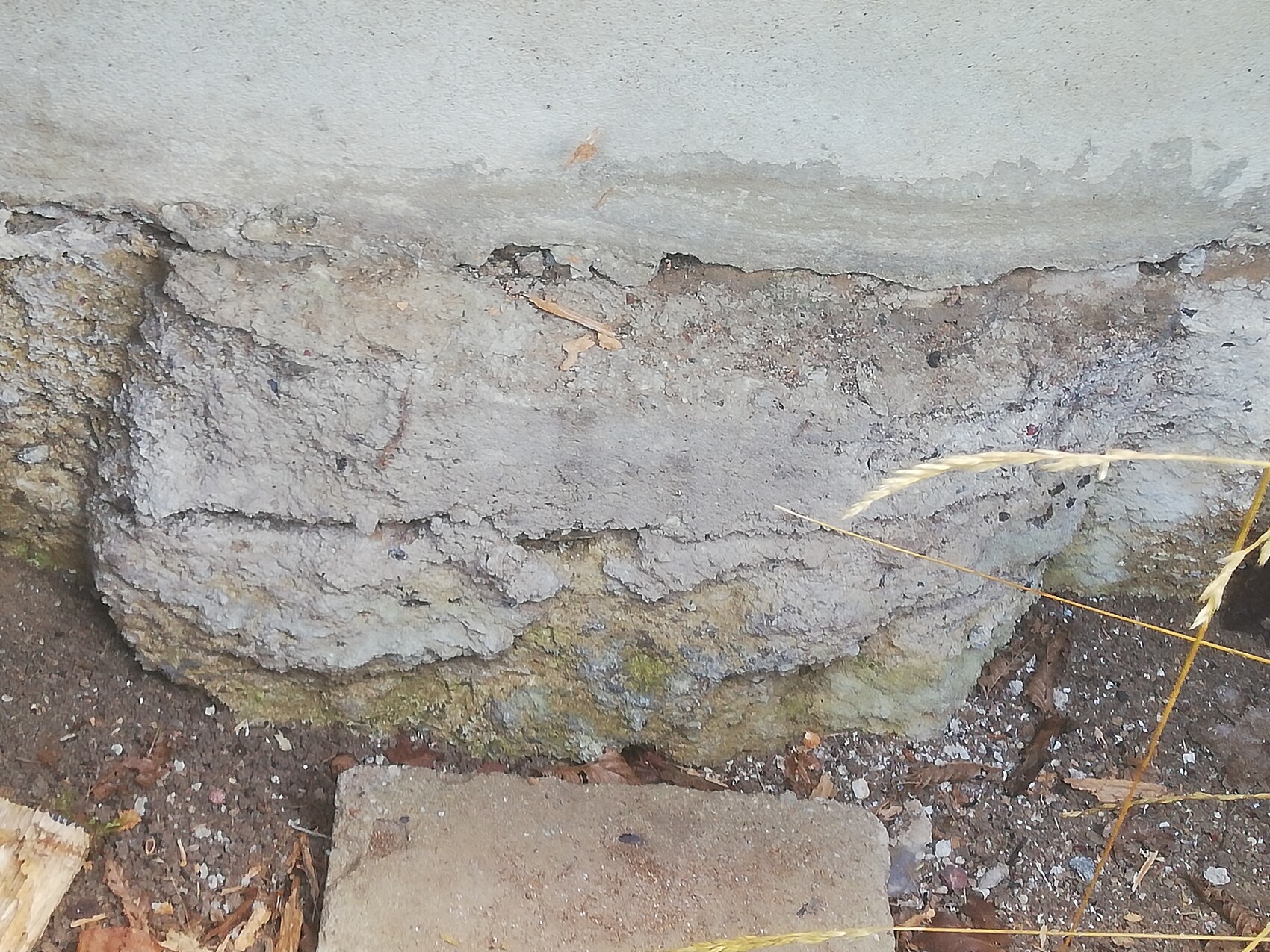 Außenwand mit abgeplatztem Putz, feuchtem Mauerwerk und Moos am Fundament.
