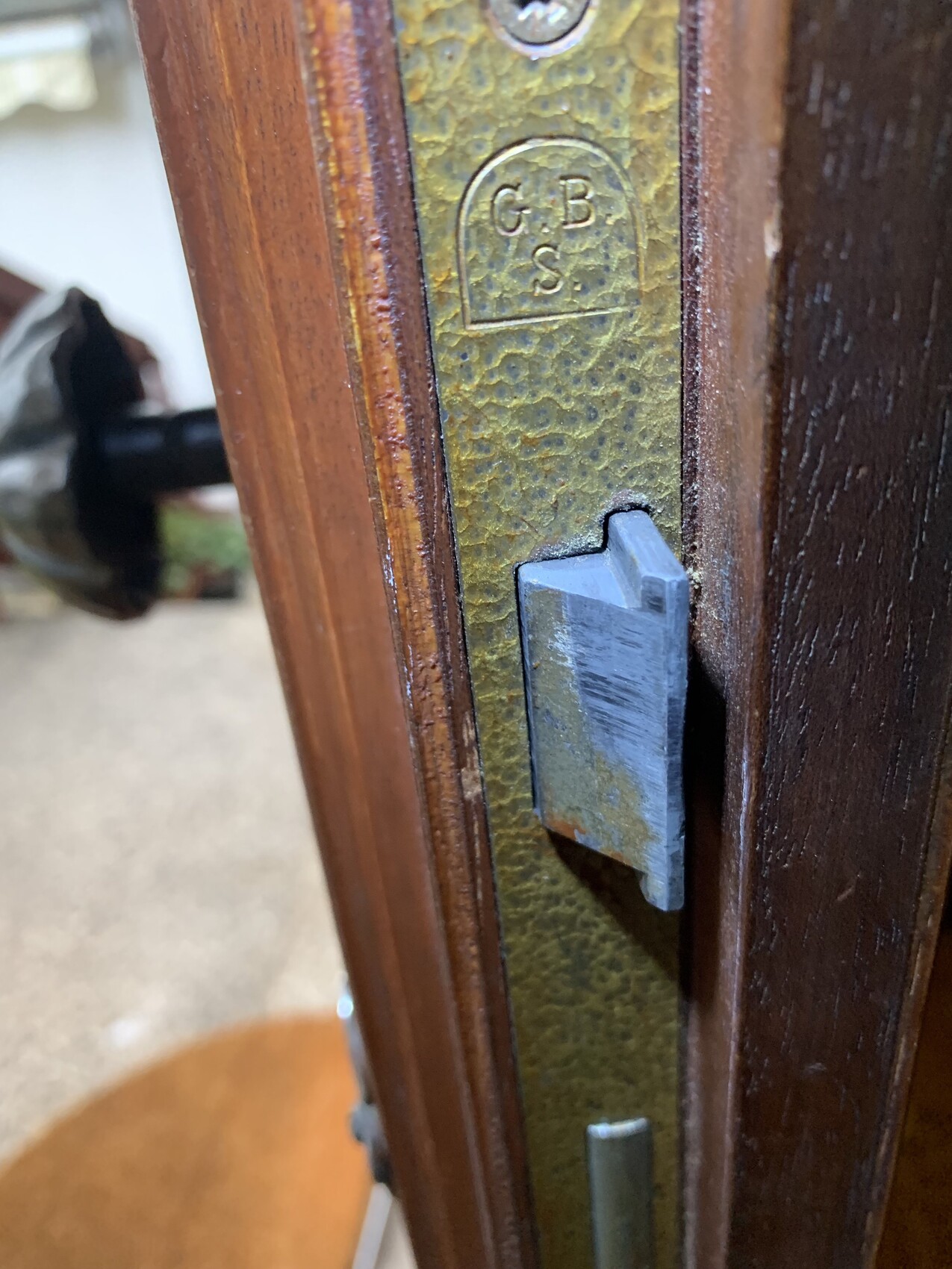 Nahaufnahme eines korrodierten Türbeschlags am Türrahmen mit metallischer Platte.