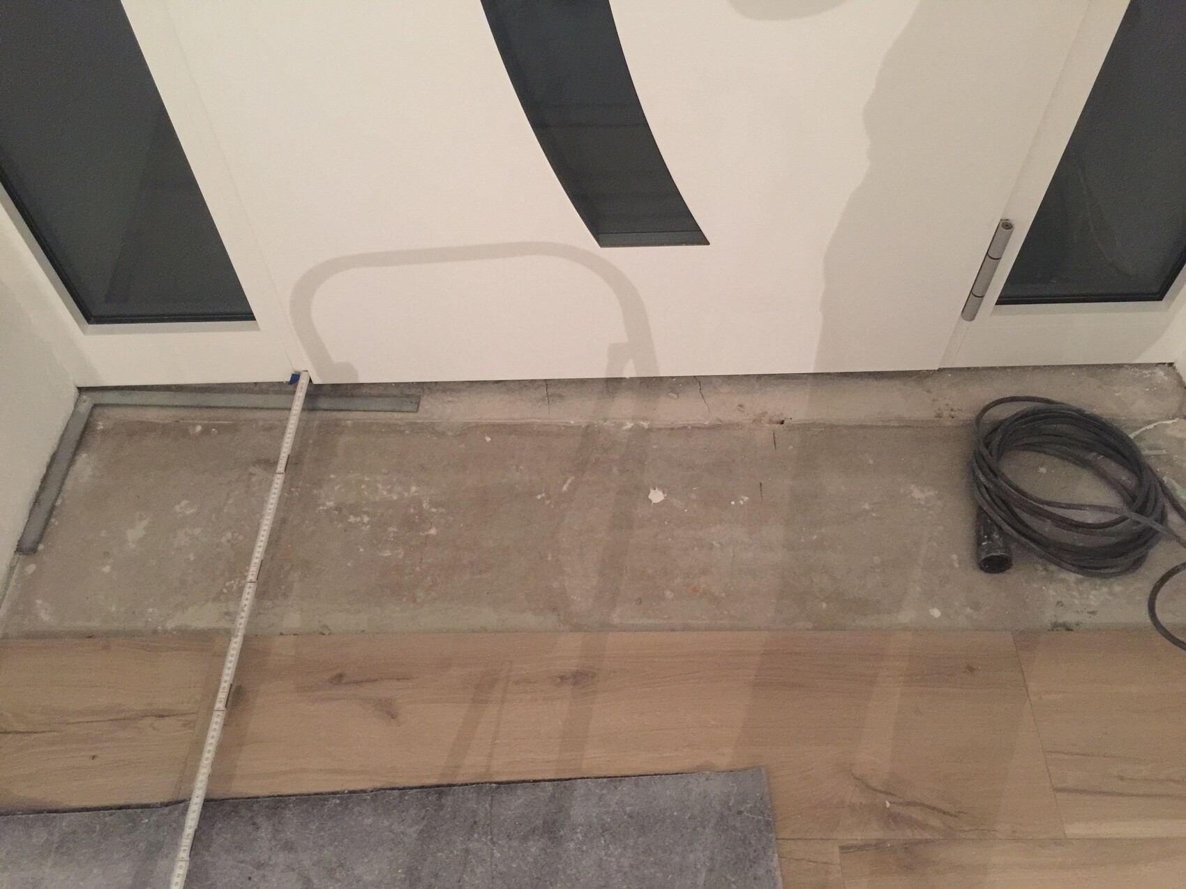 Unsere Haustür wurde nicht rechtwinklig zu den Wänden, sondern einfach zu dem unverputzten gegossenen Türsturz abgestellt. Dies ist uns leider bzw. dem Fliesenleger jedoch erst bei dem Aufmaß der Fliesen aufgefallen.