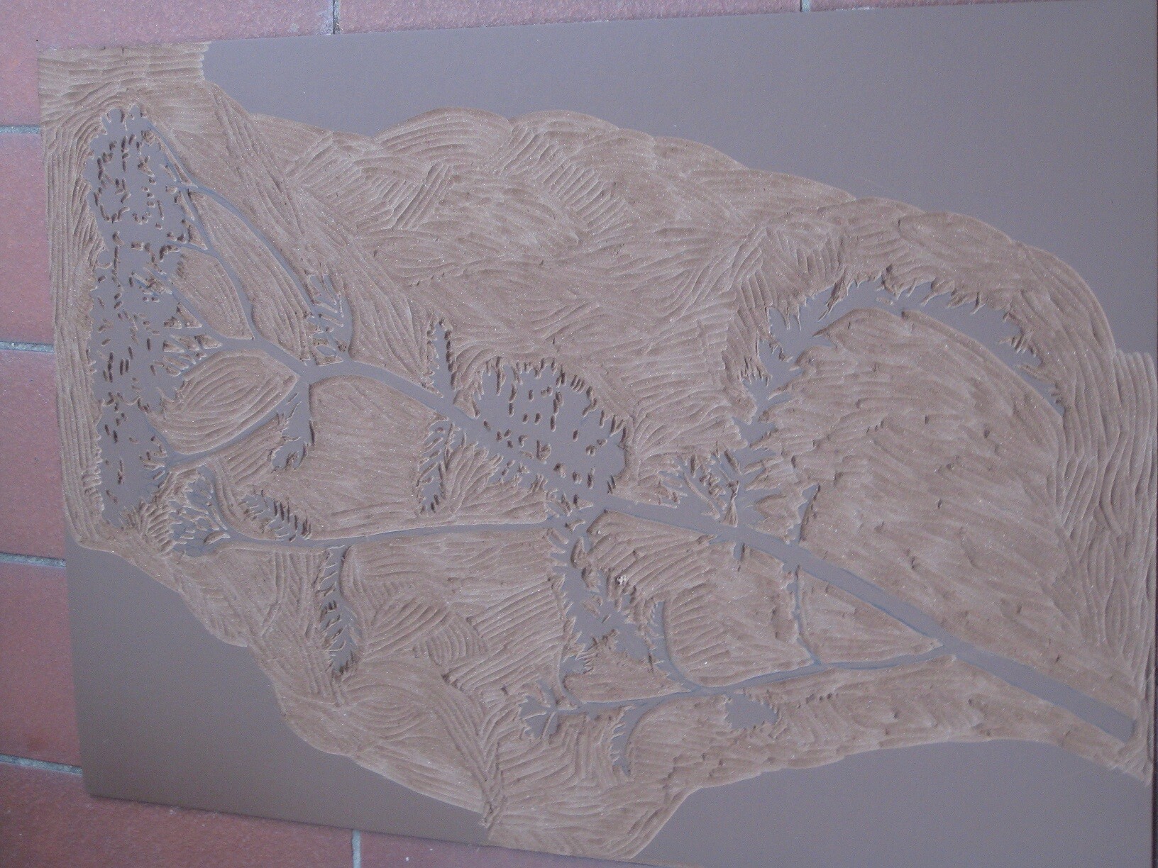 Das ist der Druckstock für die Abschlussbordüre der WZ-Übergardinen, eine Schafgarbe in ca. 60 cm. Heute freier Tag, ruhende Baustelle, erster Probedruck.