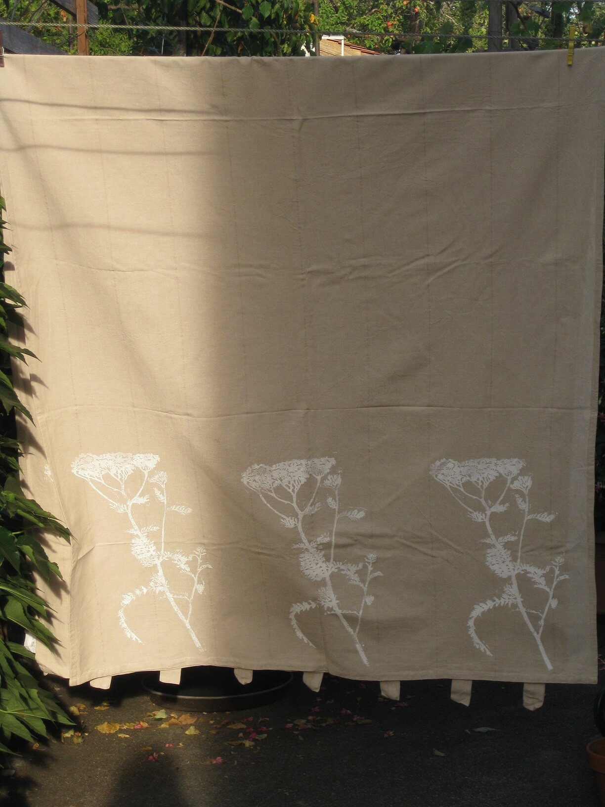 Die Gardinen sind bodenlang, die Schafgarben ca. 60 cm hoch, der Stoff Naturfaser.