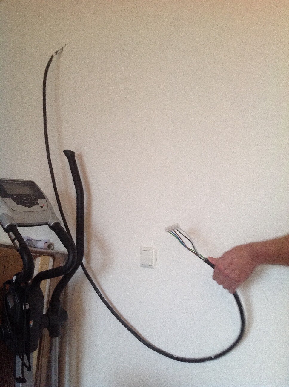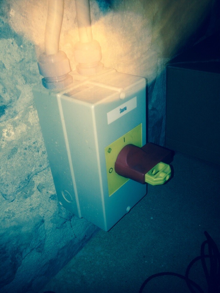 Die Sauna, die mit Starkstrom betrieben wird, trauen wir uns so nicht anzuschließen. Der "geeignete Hauptschalter am Ende des Zuleitungskabels" der Teil des Bauvertrags ist, sieht verzweifelt wie ein Lichtschalter aus, egal, wie oft wir ihn beäugen. Es ist meinem Mann schleierhaft, wie der Elektriker da überhaupt zwei daumendicke Kabelenden reinquetschen konnte.