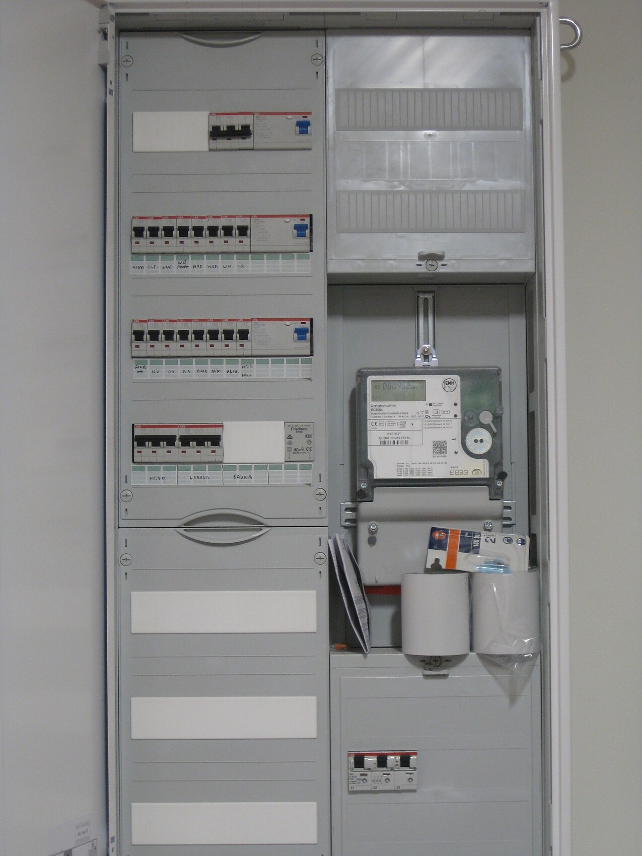 Elektrischer Verteilerschrank mit Zähler, Sicherungen und Kabelmanagement.