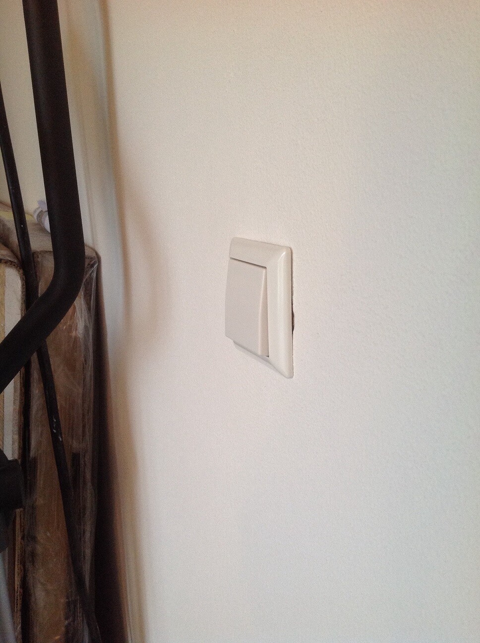Weißer Wandschalter an heller Wand, nahe dunkler Metallrahmen am linken Bildrand.