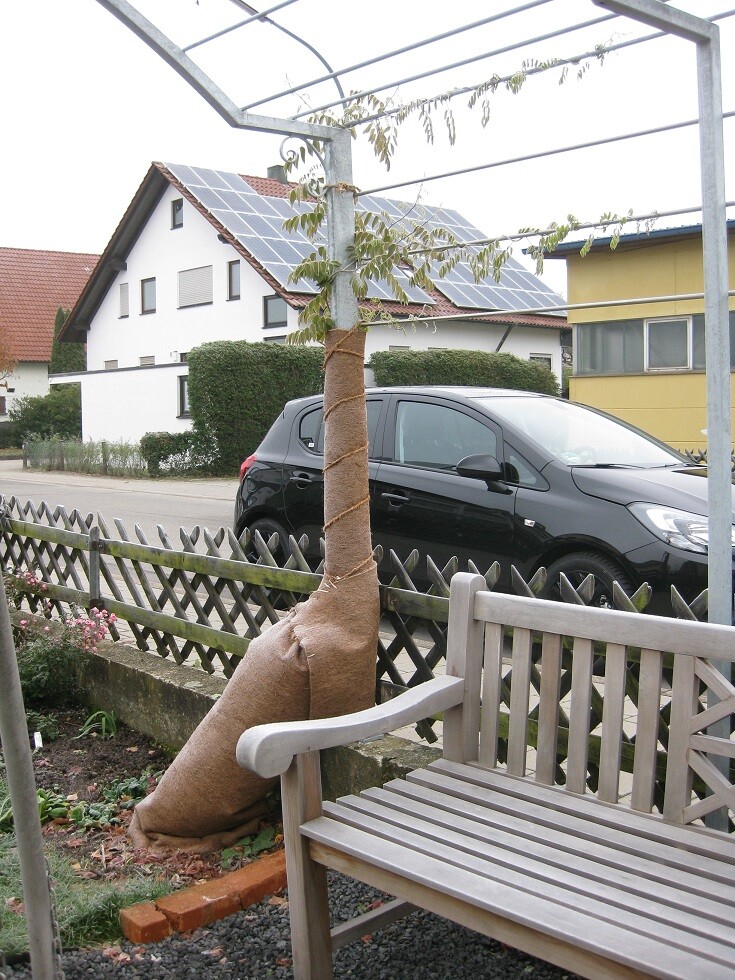 Nun freue ich mich darüber, dass trotz zeitlicher Problemchen alles im Garten rechtzeitig Winterschutz erhielt. Da wir aus einem Weinbauklima in ein Klima eine Jacke kälter zogen, erhielt der junge Blauregen, der sich in seinem ersten Jahr bereits fleißig an der Pergola zu schaffen machte, einen Winterschutz aus Kokosmatte mit Laub gefüllt. Auch dem Rosmarin zog ich Ähnliches an. Die ganze Nordseite erhielt reichlich Laub als Schutz.