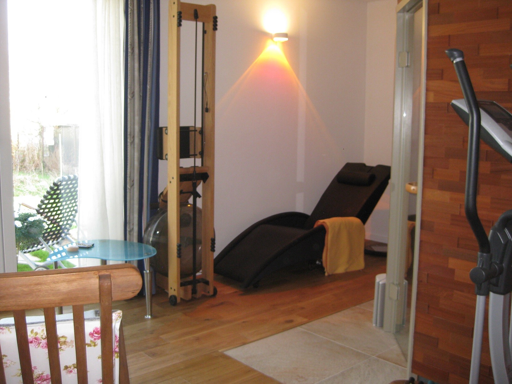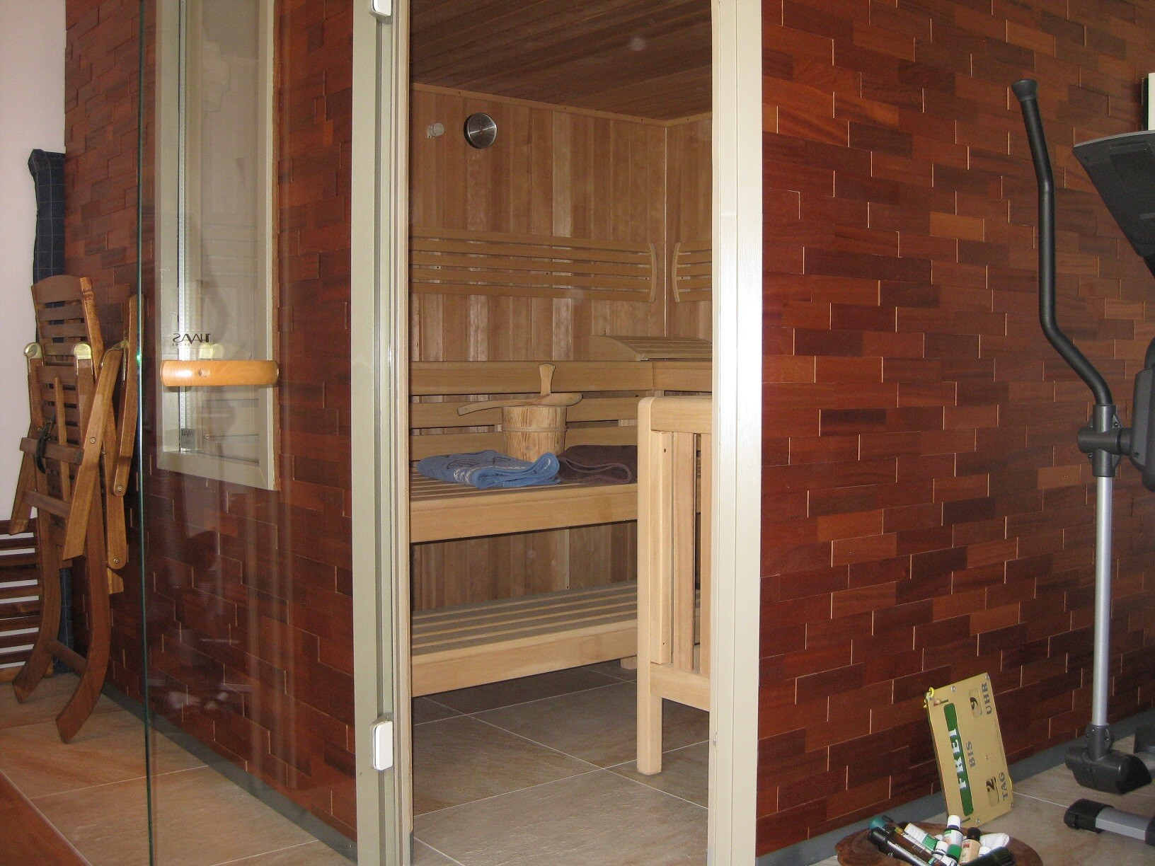 Unser Saunabereich ist bis auf gestalterische Details soweit baulich fertiggestellt. Gestalterisch muss ich da noch mal ran, so ein dunkler Klops will sorgfältig in einen hellen Raum eingebunden werden und das ist noch nicht geschehen. Am Freibereich haben wir sogar jetzt in der warmen Jahreszeit viel Freude: Es entstand ein kleiner diskreter Rückzugsraum im schattigen Norden, wo man...Frau übrigens auch...schön in der Deckung mal ein Päuschen halten kann. Hier die Bilder: