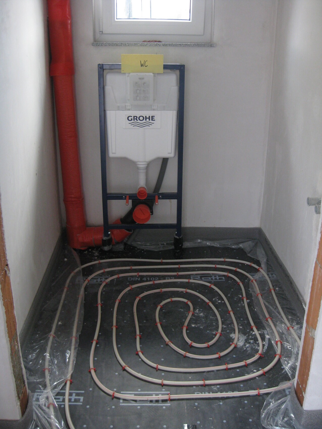 Auf unsren Bauplänen ist der Duschablauf rechts in der Duschwannenecke, er wurde links gebaut. Und unter der Duschwanne kam dies zum Vorschein: