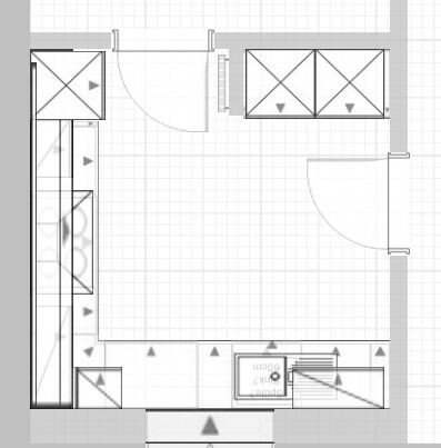 Ich würde folgenden Ansatz verfolgen ... in der Ecke 2 hochschränke für Backofen, Vorräte etc. mit Innenauszügen. Man könnte den Vorratsschrank auch mit Auszügen unten, davon einer ein Tischauszug zum Abstellen, ausrüsten. Im oberen Teil des Vorratsschrankes dann Tür mit Innenauszügen.