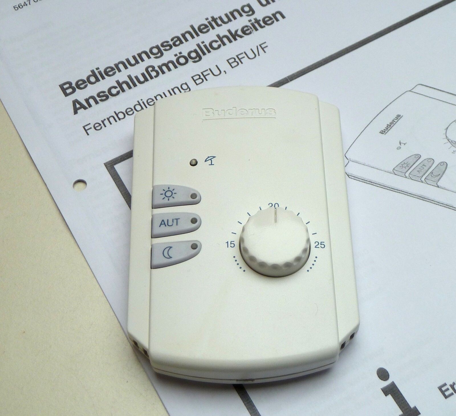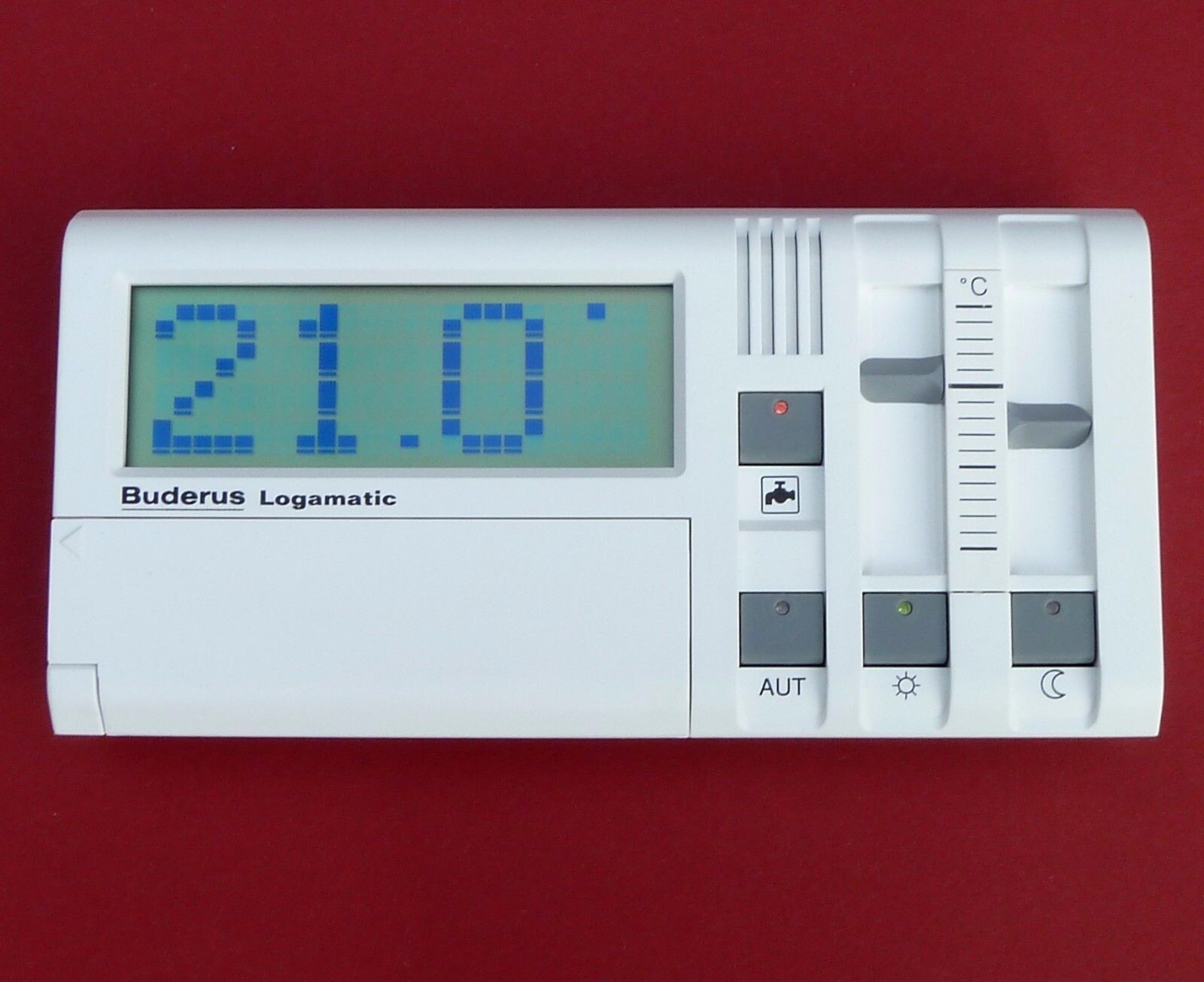 Auf dem steht Buderus Ecomat 4000 und da kann man auf verschiedene Tasten drücken. Dieses Gerät hing hier an der Wand und zu der Wand geht ja ein Kabel. Das Gerät war aber tot und unten kann man das in dieses blaue Regel-Kästchen Einklicken und da ging aber gar nichts. Deswegen, so habe ich den Monteur verstanden, kann man auch nichts mehr umstellen.