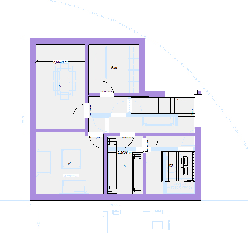 Grundriss eines Hauses mit Küche (K), Bad, Schlafzimmer (SZ), Raum A und Treppen.