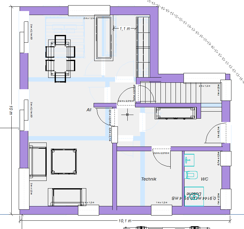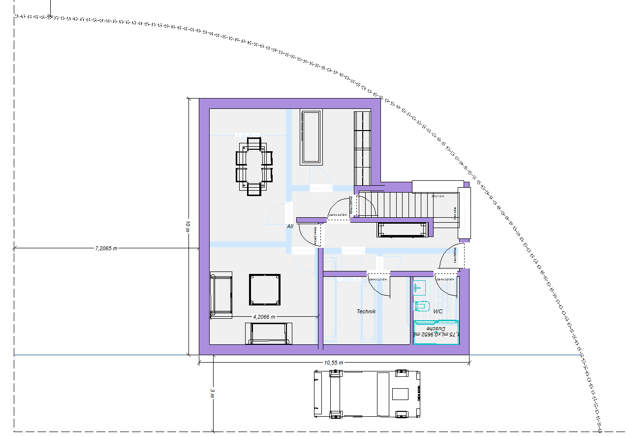 Grundriss eines Hauses mit Treppe, Technikraum, WC, Wohnzimmer mit Esstisch und Sofa; lila Außenwände