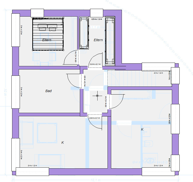 Grundriss eines Hauses mit zwei Elternschlafzimmern, Bad, Küche und Treppenaufgang.