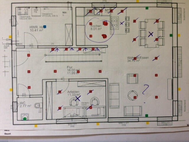 Küche: Über der Kochplatte ist die (nicht eingezeichnete) Abzugshaube. Daher wirkt der Bereich dort leer. Ich möchte die Spots über der Arbeitsplatte und die anderen Spots eigentlich separat schaltbar machen. Zum Arbeiten und einmal zum Erleuchten der ganzen Küche. Das war zumindest die Idee.