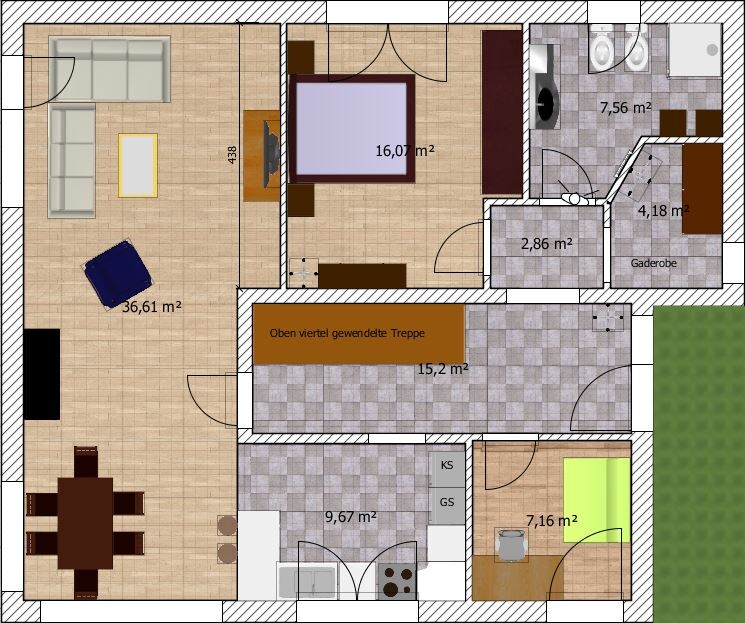 Baukosten können hier deutlich gesenkt werden, wenn man sich auf eine kleinere Fläche für's Herumlaufen beschränkt. Und es gibt sogar bei gleicher Treppenposition Lösungen, ohne daß Gäste am Schlafzimmer vorbei müssen.