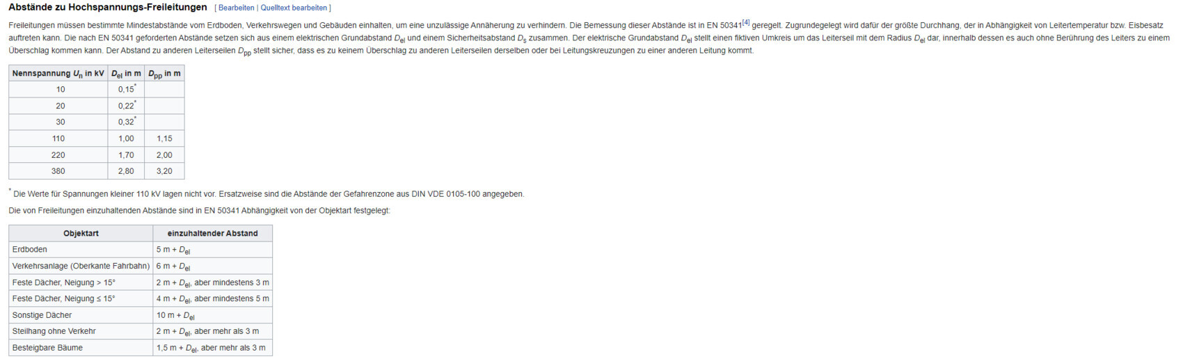 Die "rechtliche" Quelle ist die DIN VDE 0210. Darin stehen die Mindestabstände bei Freileitungen.