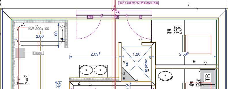 Über der Sauna wird abgekoffert; also Sauna wird normal raumhoch oder auch etwas niedriger und drüber eine Wand unters Dach. Die Seite planrechts in der Dusche sowie die Rückwand sind auch raumhoch bis unters Dach (da hinter der Rückwand der Gang ist und planlinks Hauswirtschaftsraum und Sauna).