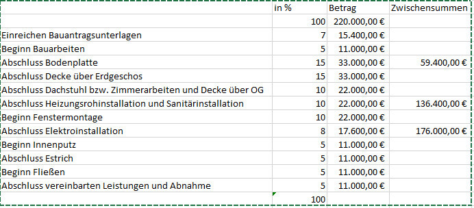 Sofern ich mich an andere viele Bauzahlpläne erinnere, ist dieser hier noch mit seinen 52% nach Rohbau sehr human.