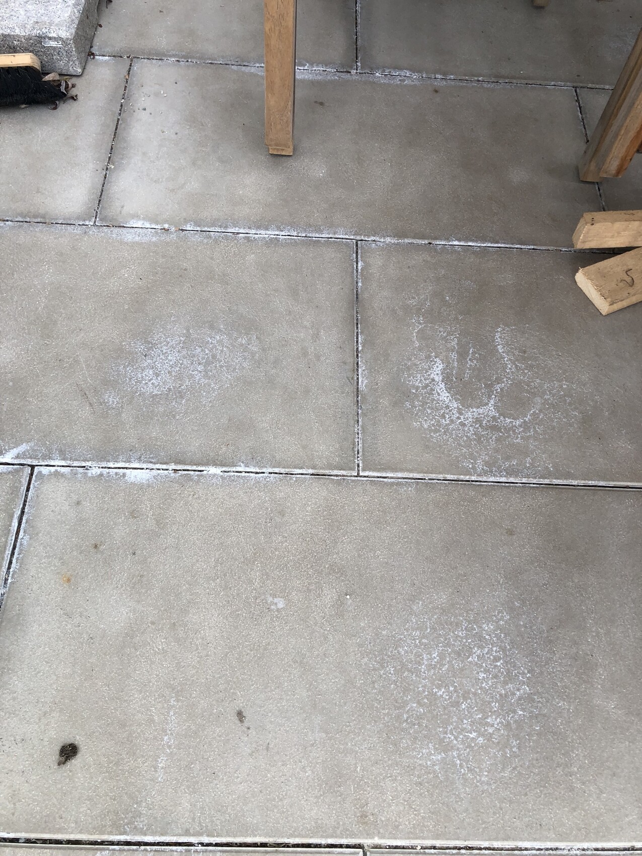 Der Zement sollte durch Regen wieder weggewaschen werden, aber wir haben mittlerweile ein Dach drüber. Ich habe daher den Schleier schon zwei mal mit dem Reiniger (Salzsäure) von Godelmann entfernt. Der Schleier kommt aber immer wieder (s. Fotos von heute im Anhang).