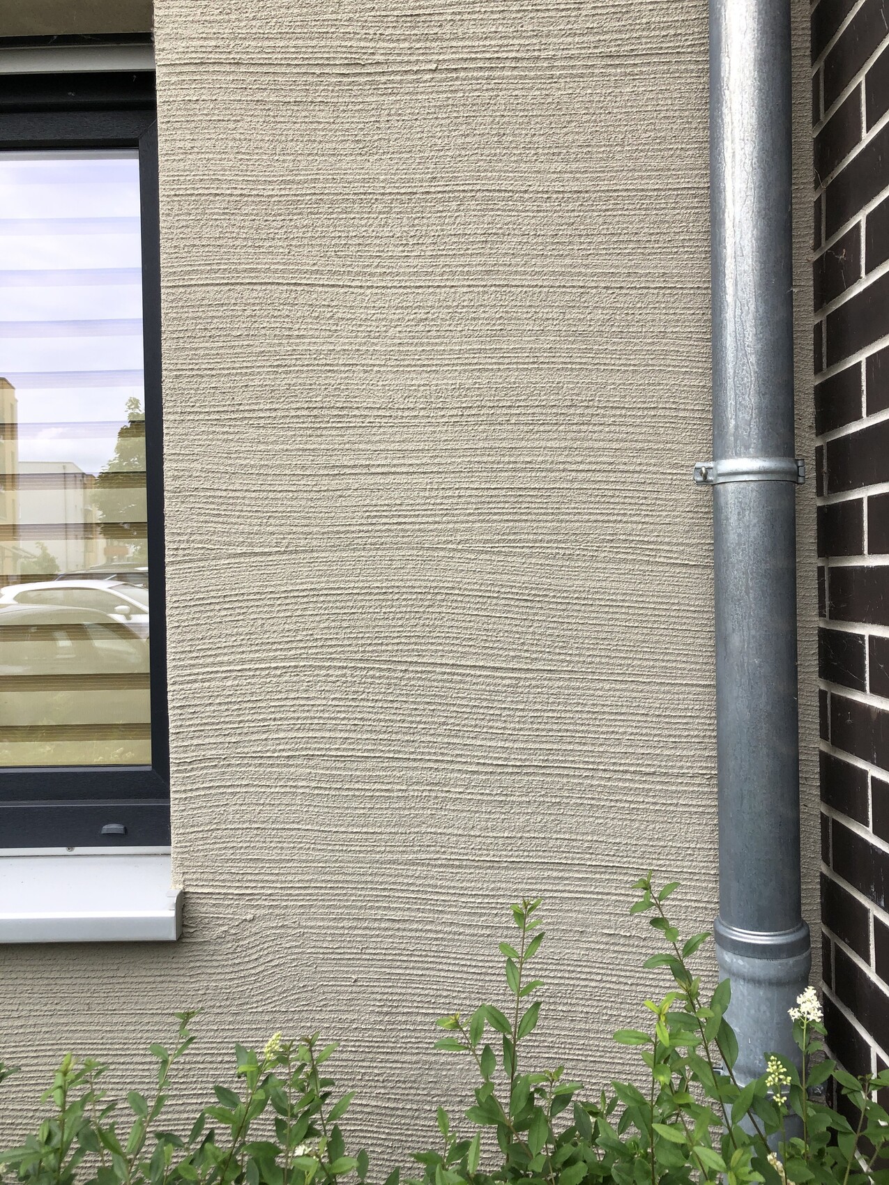 Beige Putzwand mit Fenster links, Metall-Regenrohr rechts und Pflanzen unten.