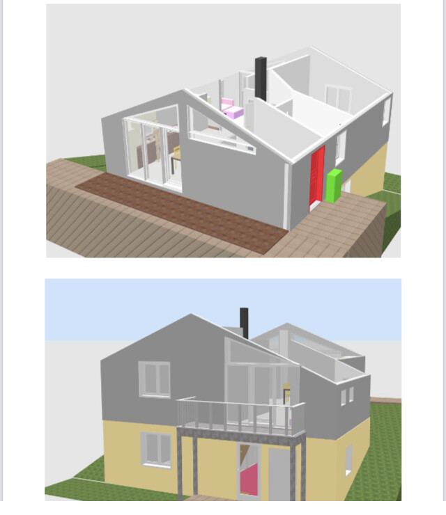Foto2: Laienhaftes Bild des Hauses (grau soll Holz darstellen und gelb den Putz)