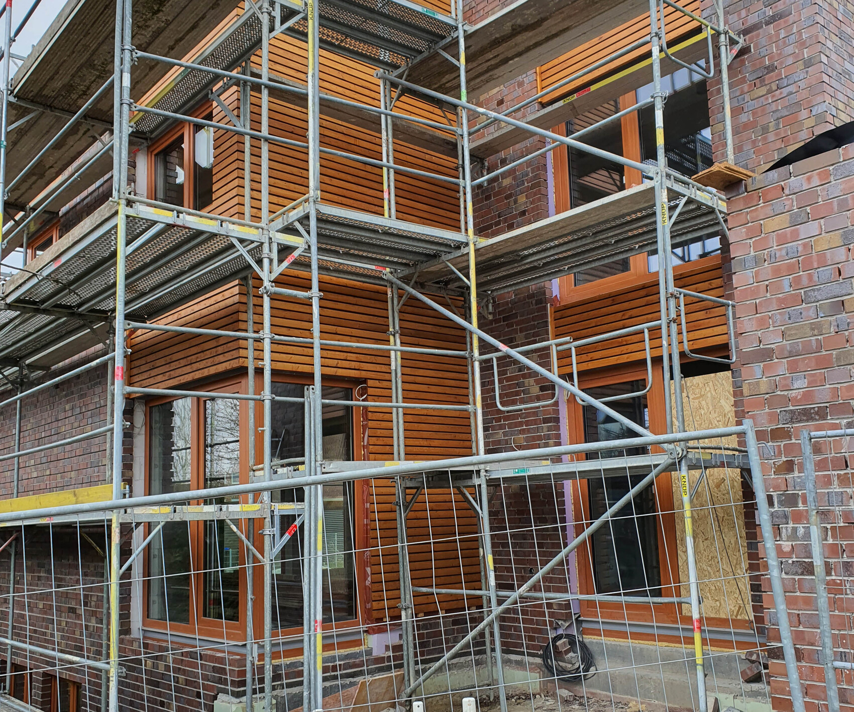Außenansicht eines Baugerüsts am Backsteingebäude mit orangenen Fensterrahmen.