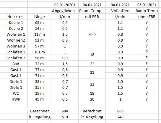 Die Anlage läuft mit ERR Durchflussmenge 430-450 l/h bei 3 geöffneten Stellantriebe davon 2 Stück Flur und 1 Stück Bad also 11 von 14 Heizkreisen aktuell geschlossen. Verteiler anhand der Berechnung und Erfahrung seit dem wir im Haus sind grob eingelitert.