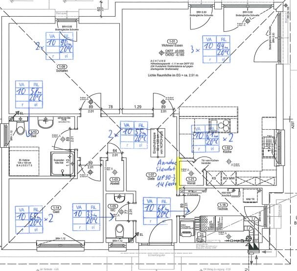 Da es sich um nen Bungalow handelt sind alle Räume nebeneinander... Bad könnte wie schon erkannt problematisch werden wenn ich das danebenliegende Schlaf-und Gästezimmer zu sehr drossel... Den Technik/Hauswirtschaftsraum-Raum würde ich sogar soweit drosseln wollen, das nur der minimalst mögliche Durchfluss durchgeht der Raum wird eh durch Fremdeinflüsse wie Wechselrichter, Trockner, Heizkreisverteiler und Co. warm genug.