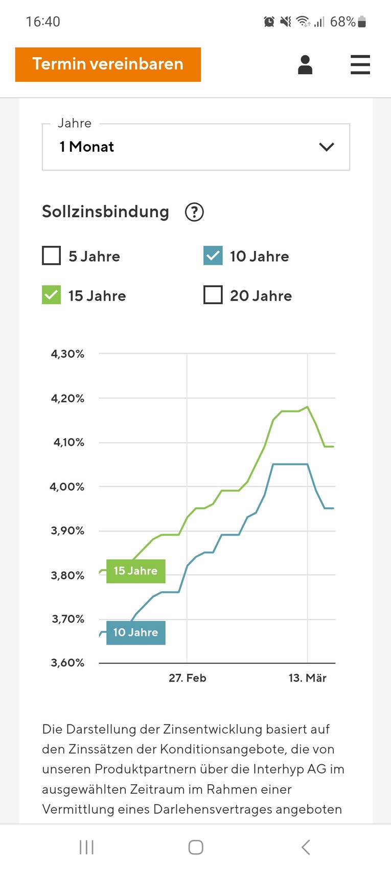 Mit meinen großartigen Paint-Skills habe ich mal den Chart oben neben den Zins-Chart von Interhyp gelegt und versucht die Achsen ähnlich zu skalieren. Dieser (ich zitiere) "basiert auf den Zinssätzen der Konditionsangebote, die von unseren Produktpartnern über die Interhyp AG im ausgewählten Zeitraum im Rahmen einer Vermittlung eines Darlehensvertrages angeboten wurden." entspricht also real angebotenen Konditionen.