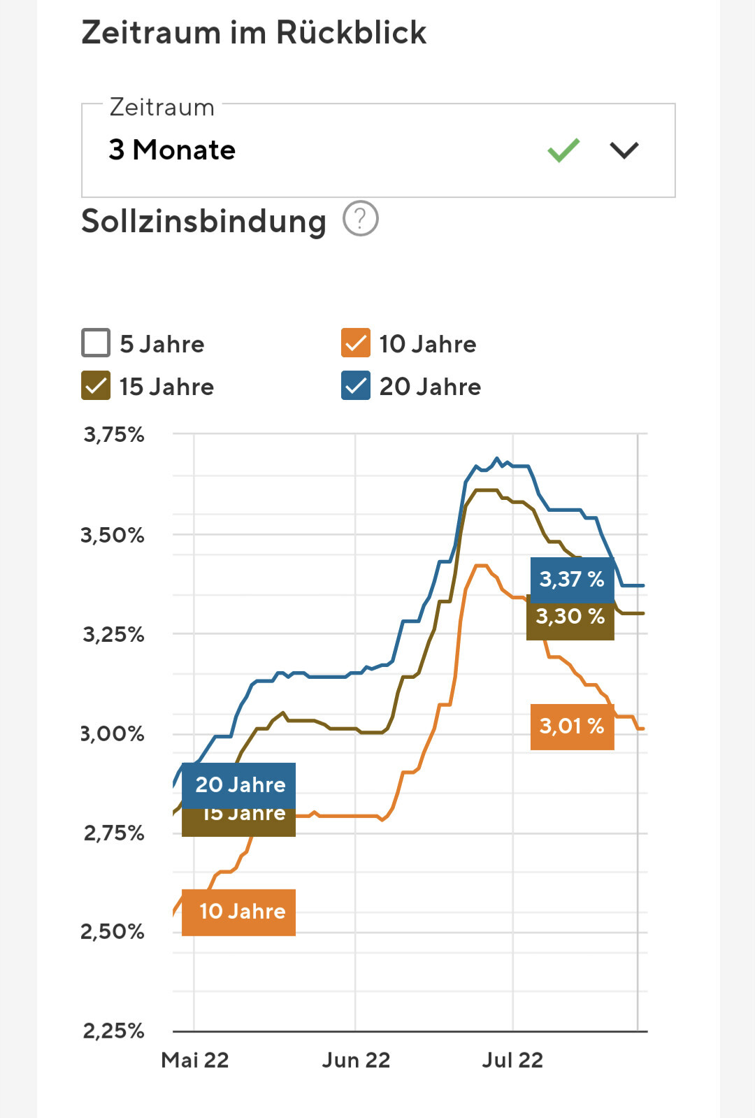 Natürlich ist es immer noch viel zu den letzten Jahren, aber viel weniger als der Schnitt der letzten Dekaden.Ich war heute bei meiner Hausbank, um die Konditionen abzufragen. Bei einer 80% Finanzierung und 2% Anfangstilgung bieten sie mir Stand heute 3,3% auf 15 Jahre Zinsbindung an. Das ist ziemlich mau. ☹Wenn ich den Zinsrechner bei Comdirect bemühe mit selben Daten, so gibt dieser 3% an auf 15 Jahre Zinsbindung.