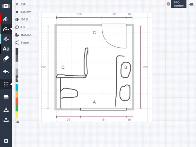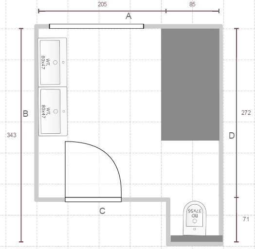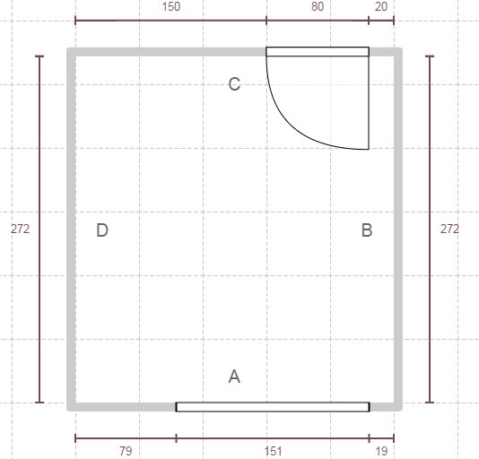 Alles ist soweit geklärt, lediglich das Badezimmer bereitet uns Kopfschmerzen. Wir haben zwei Möglichkeiten, siehe Anhänge. Wichtig ist, dass die Länge von 2,72m und die Breite von 3m fix sind. Also bei dem Entwurf mit der WC-Ecke die Wände A und B.