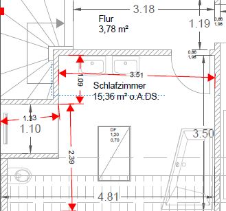 - Kinderzimmerwand soweit nach planrechts schieben, wie möglich (in etwa: gewünschte Duschtiefe plus Tür plus x = Breite Bad).