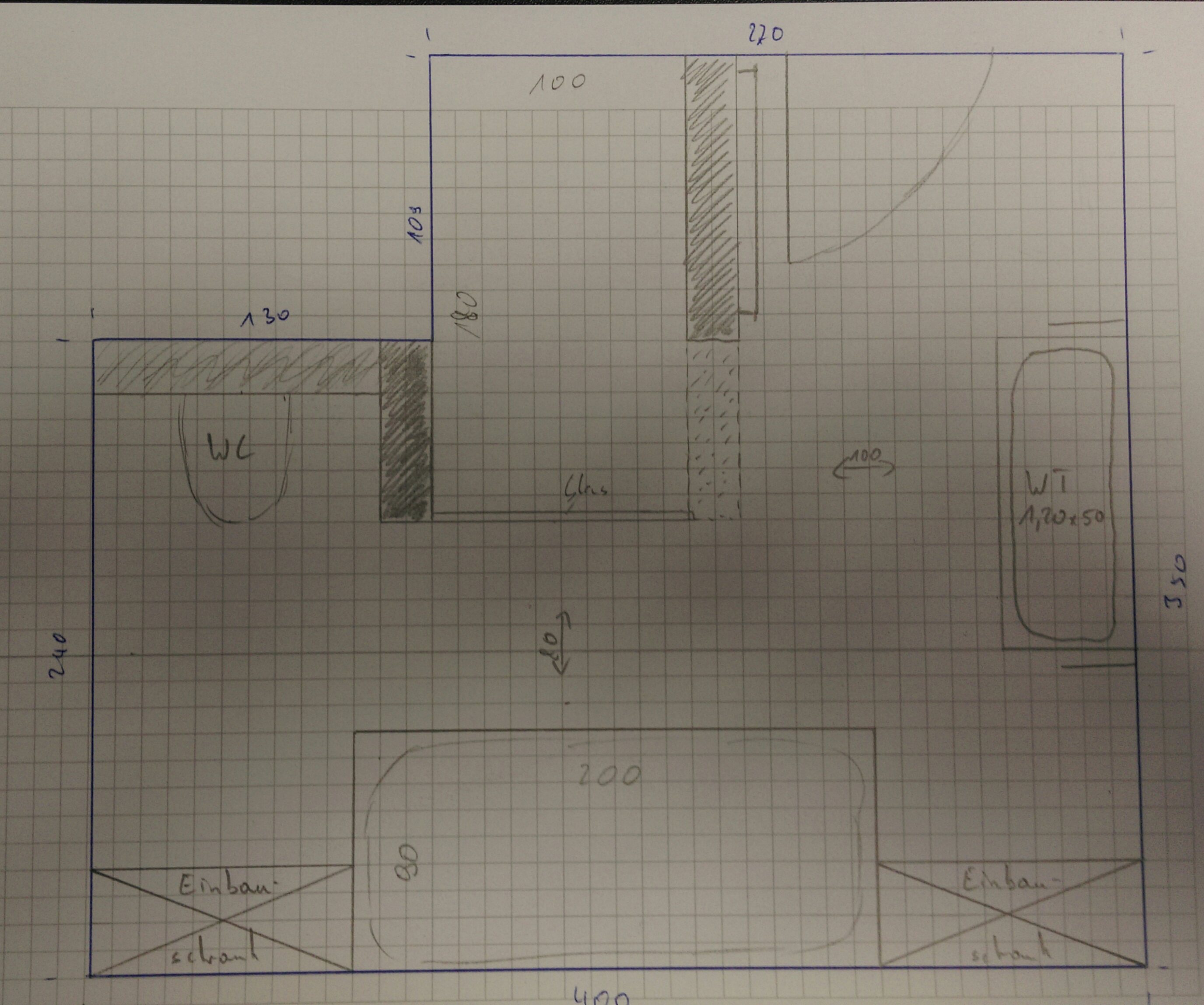 Jetzt muss ich hoffen, dass sich die Anschlüsse und Wasser so realisieren lassen. Unter der Toilette verläuft ja das Treppenhaus weiter.