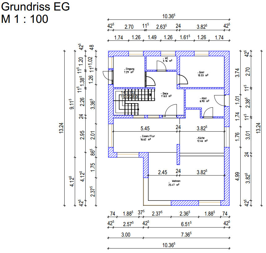 - Die Verkehrsfläche ist durch Eingang plus (dunkle) Diele übertrieben gross.